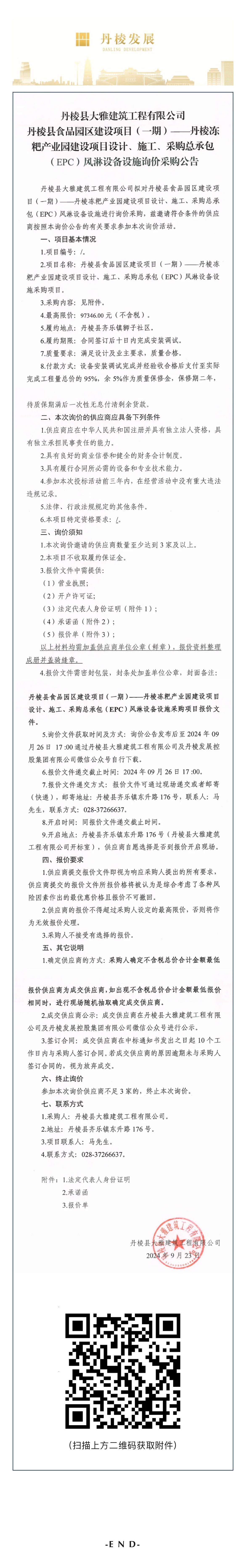 縣大雅建筑公司丹棱縣食品園區(qū)建設項目(一期)—丹棱凍粑產業(yè)園建設項目設計、施工、采購總承包(EPC)風淋設備設施詢價采購公告