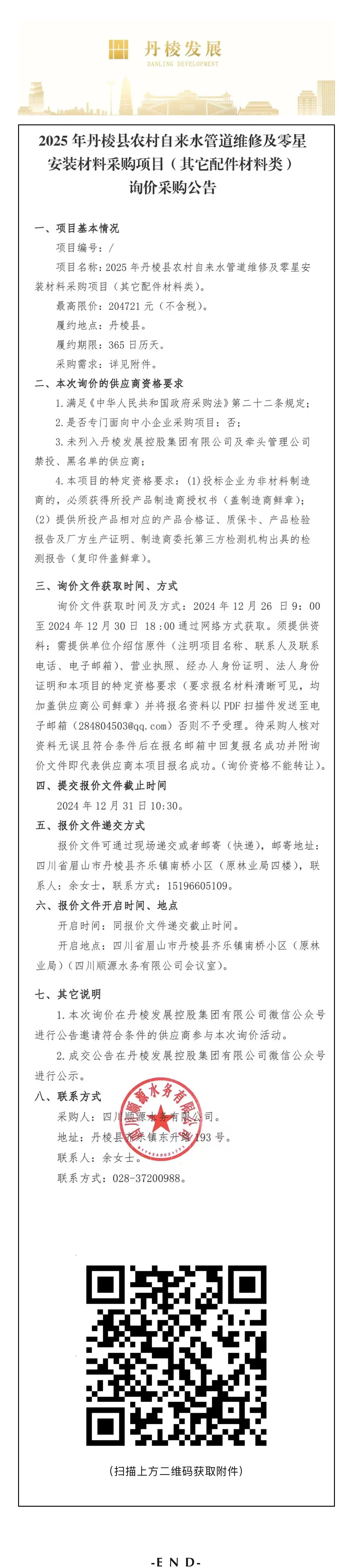 2025年丹棱縣農(nóng)村自來水管道維修及零星安裝材料采購項目(其他配件材料類)詢價采購公告