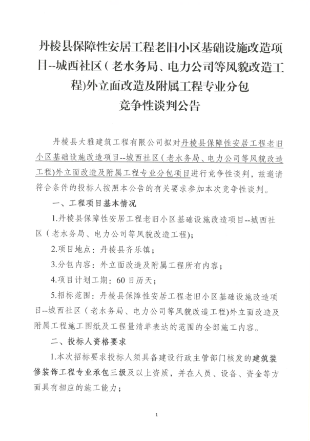 【大雅建筑公司】丹棱縣保障性安居工程老舊小區(qū)基礎(chǔ)設(shè)施改造項(xiàng)目--城西社區(qū)(老水務(wù)局、電力公司等風(fēng)貌改造工程)外立面改造及附屬工程專業(yè)分包競爭性談判公告