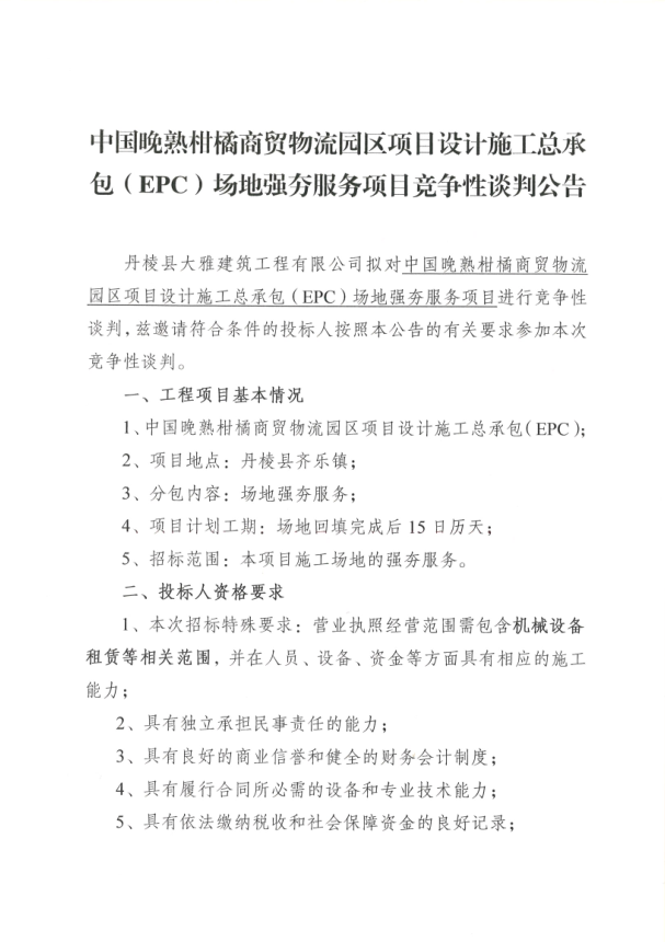 【大雅建筑公司】中國晚熟柑橘商貿(mào)物流園區(qū)項目設(shè)計施工總承包(EPC)場地強(qiáng)夯服務(wù)項目競爭性談判公告