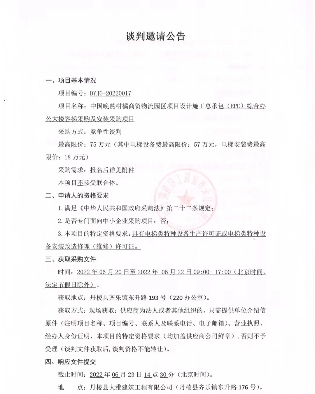 中國晚熟柑橘商貿(mào)物流園區(qū)項(xiàng)目設(shè)計(jì)施工總承包(EPC)綜合辦公大樓客梯采購及安裝采購項(xiàng)目談判邀請(qǐng)公告