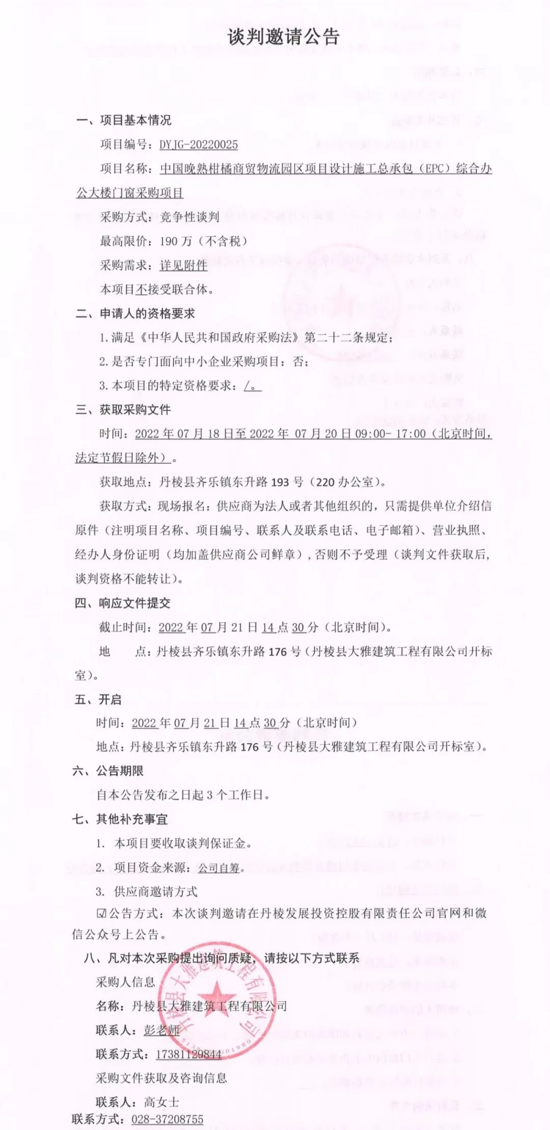中國晚熟柑橘商貿物流園區(qū)項目設計施工總承包(EPC)綜合辦公大樓門窗采購項目談判邀請公告