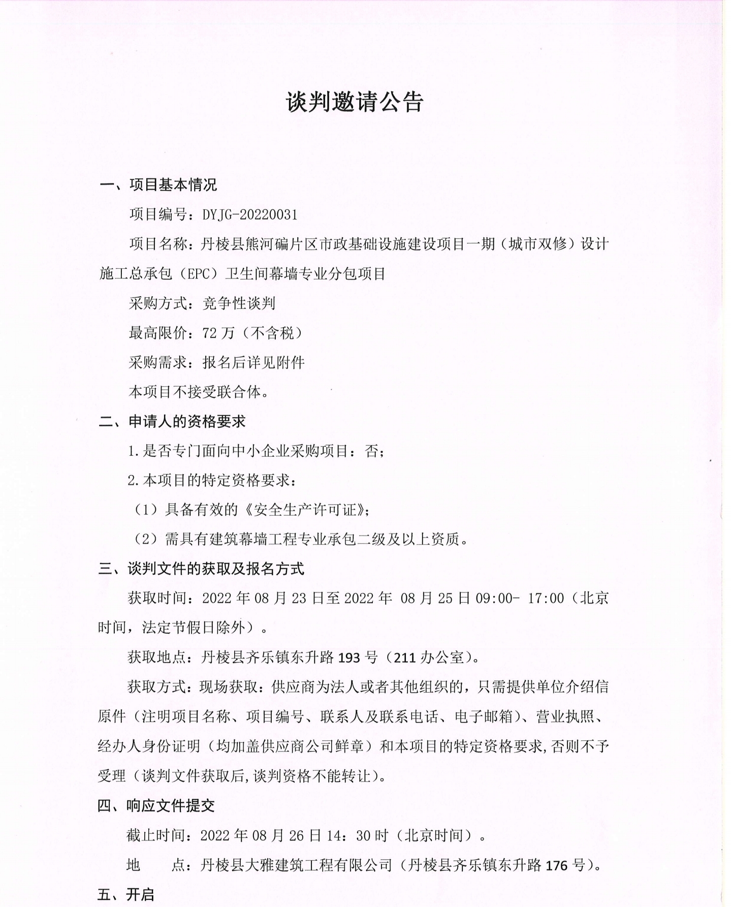 丹棱縣熊河碥片區(qū)市政基礎設施建設項目一期(城市雙修)設計施工總承包(EPC)衛(wèi)生間幕墻專業(yè)分包項目談判邀請公告