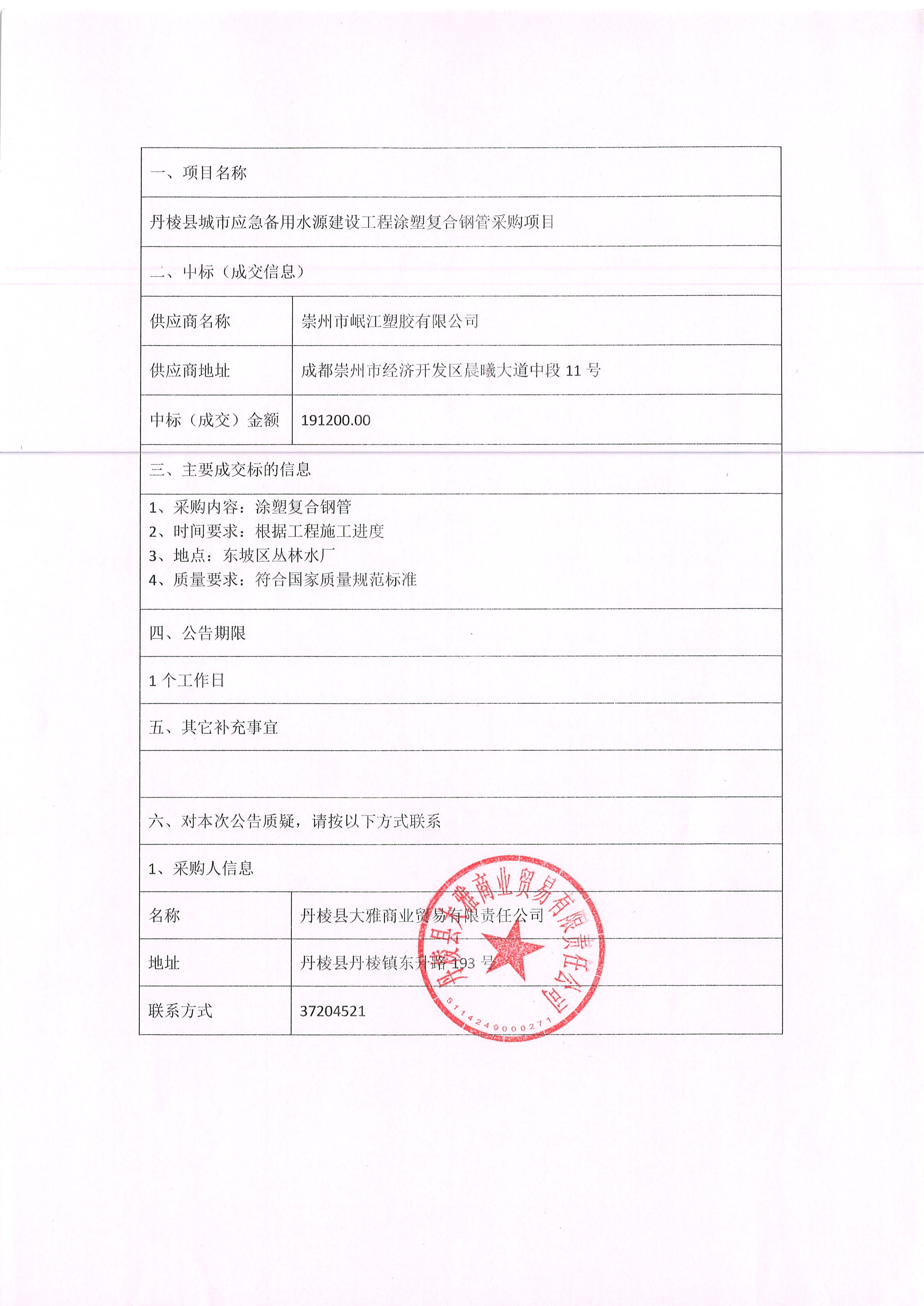 【大雅商貿(mào)公司】丹棱縣城市應(yīng)急備用水源建設(shè)工程涂塑復(fù)合鋼管采購項目中標結(jié)果公示
