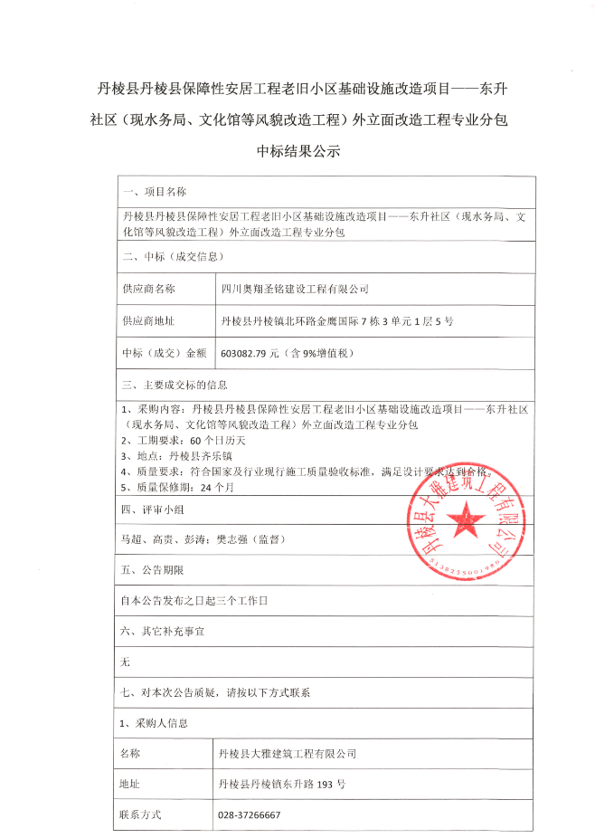 【大雅建筑公司】丹棱縣保障性安居工程老舊小區(qū)基礎(chǔ)設(shè)施改造項目--東升社區(qū)(現(xiàn)水務(wù)局、文化館等風(fēng)貌改造工程)外立面改造工程專業(yè)分包中標(biāo)結(jié)果公示