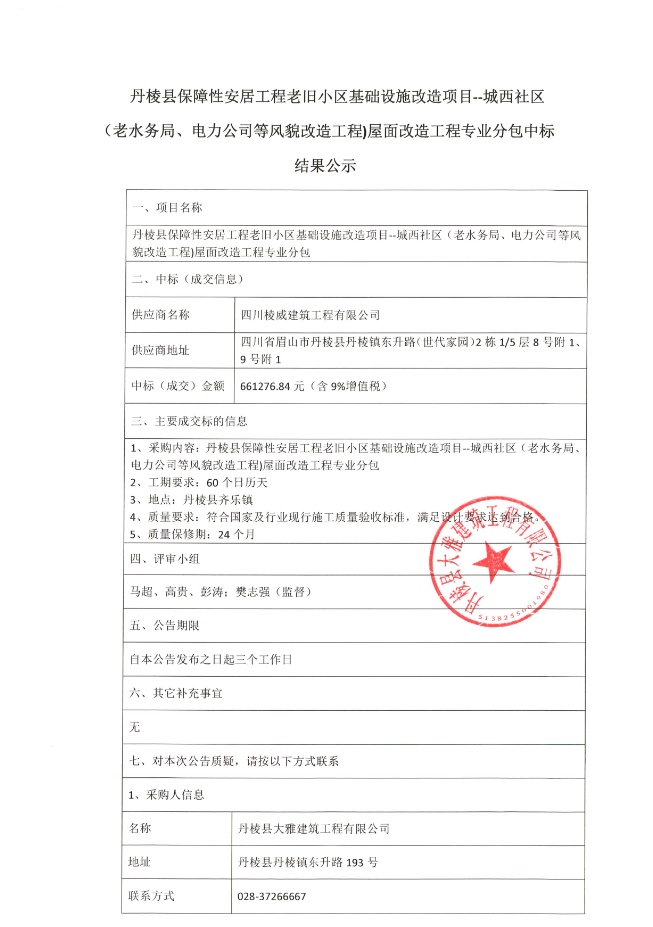【大雅建筑公司】丹棱縣保障性安居工程老舊小區(qū)基礎(chǔ)設(shè)施改造項(xiàng)目--城西社區(qū)(老水務(wù)局、電力公司等風(fēng)貌改造工程)屋面改造工程專業(yè)分包中標(biāo)結(jié)果公示