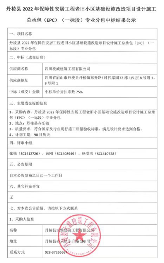丹棱縣2022年保障性安居工程老舊小區(qū)基礎(chǔ)設(shè)施改造項目設(shè)計施工總承包(EPC)(一標(biāo)段)專業(yè)分包中標(biāo)結(jié)果公示