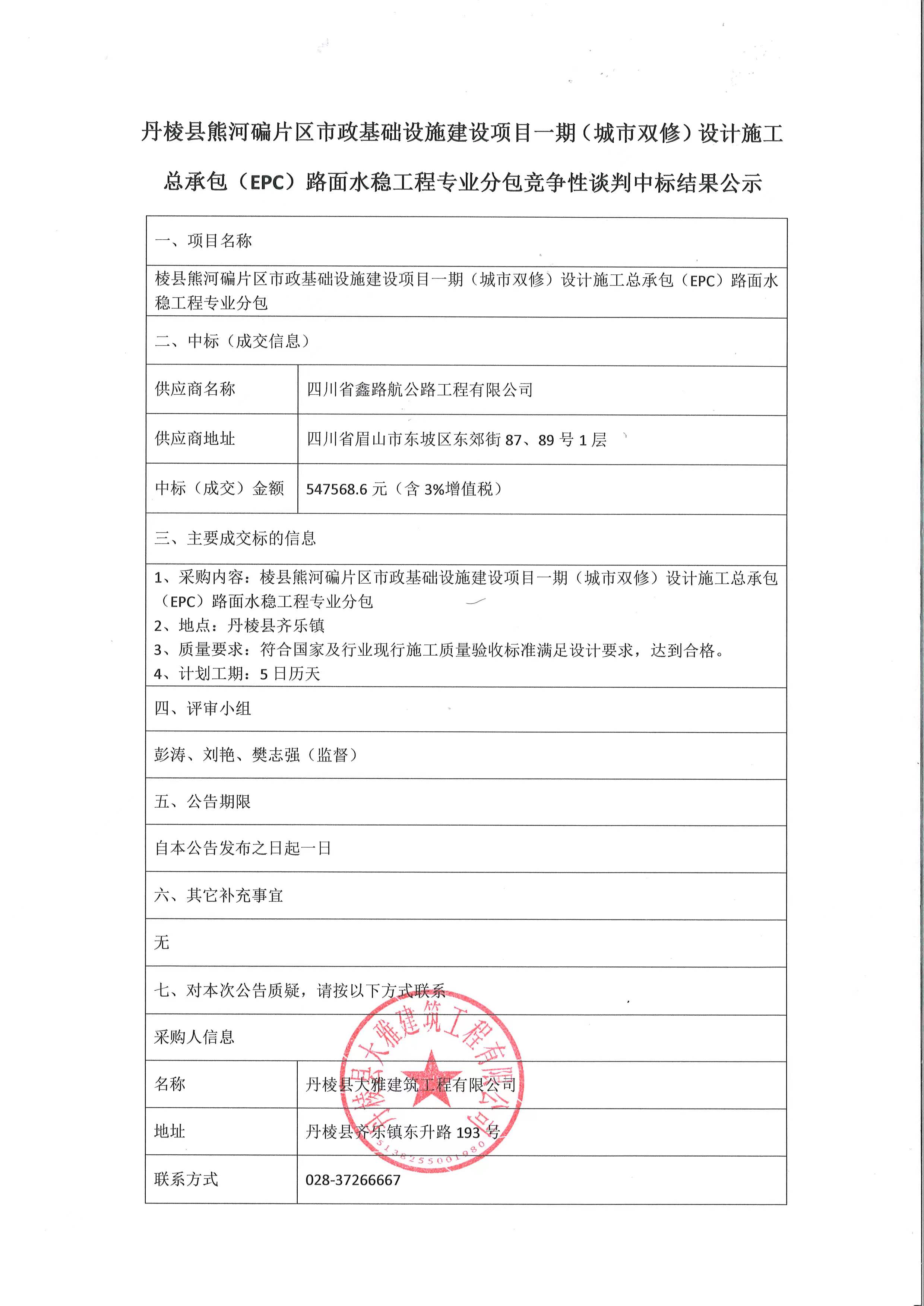 丹棱縣熊河碥片區(qū)市政基礎設施建設項目一期(城市雙修)設計施工總承包(EPC)路面水穩(wěn)工程專業(yè)分包競爭性談判中標結果公示