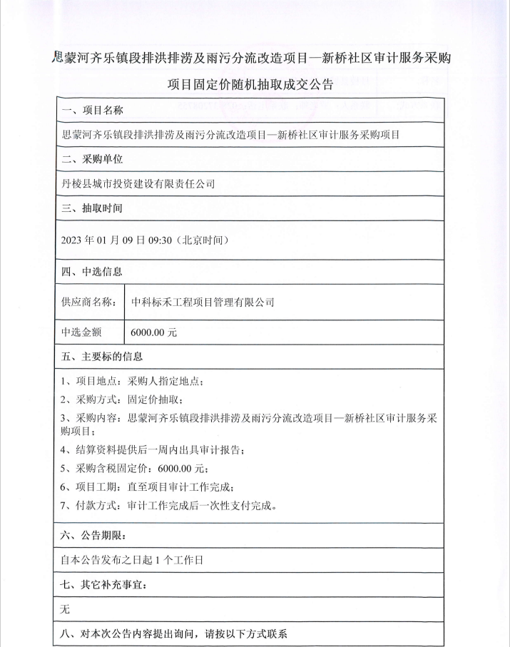思蒙河齊樂鎮(zhèn)段排洪排澇及雨污分流改造項目--新橋社區(qū)審計服務(wù)采購項目固定價隨機(jī)抽取成交公告