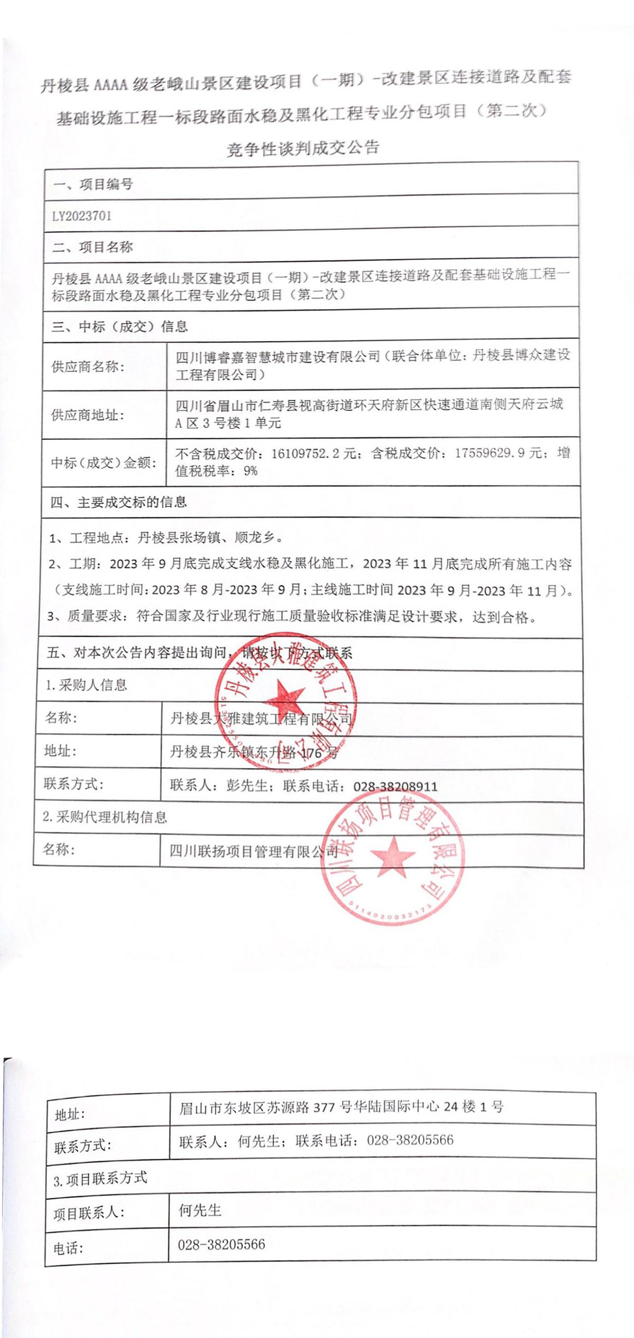 丹棱縣AAAA級(jí)老峨山景區(qū)建設(shè)項(xiàng)目(一期)—改建景區(qū)連接道路及配套基礎(chǔ)設(shè)施工程一標(biāo)段路面水穩(wěn)及黑化工程專業(yè)分包項(xiàng)目成交公告
