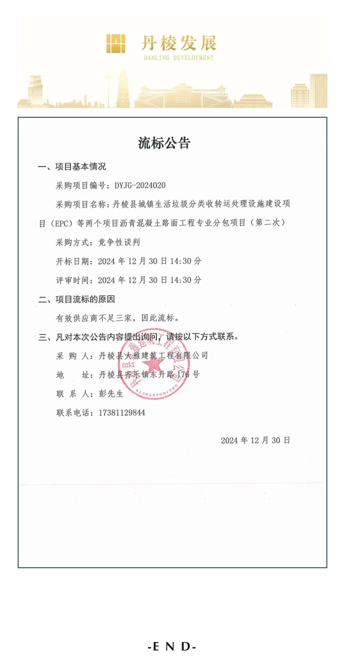 丹棱縣城鎮(zhèn)生活垃圾分類收轉(zhuǎn)運(yùn)處理設(shè)施建設(shè)項(xiàng)目(EPC)等兩個項(xiàng)目瀝青混凝土路面工程專業(yè)分包項(xiàng)目(第二次)流標(biāo)公告