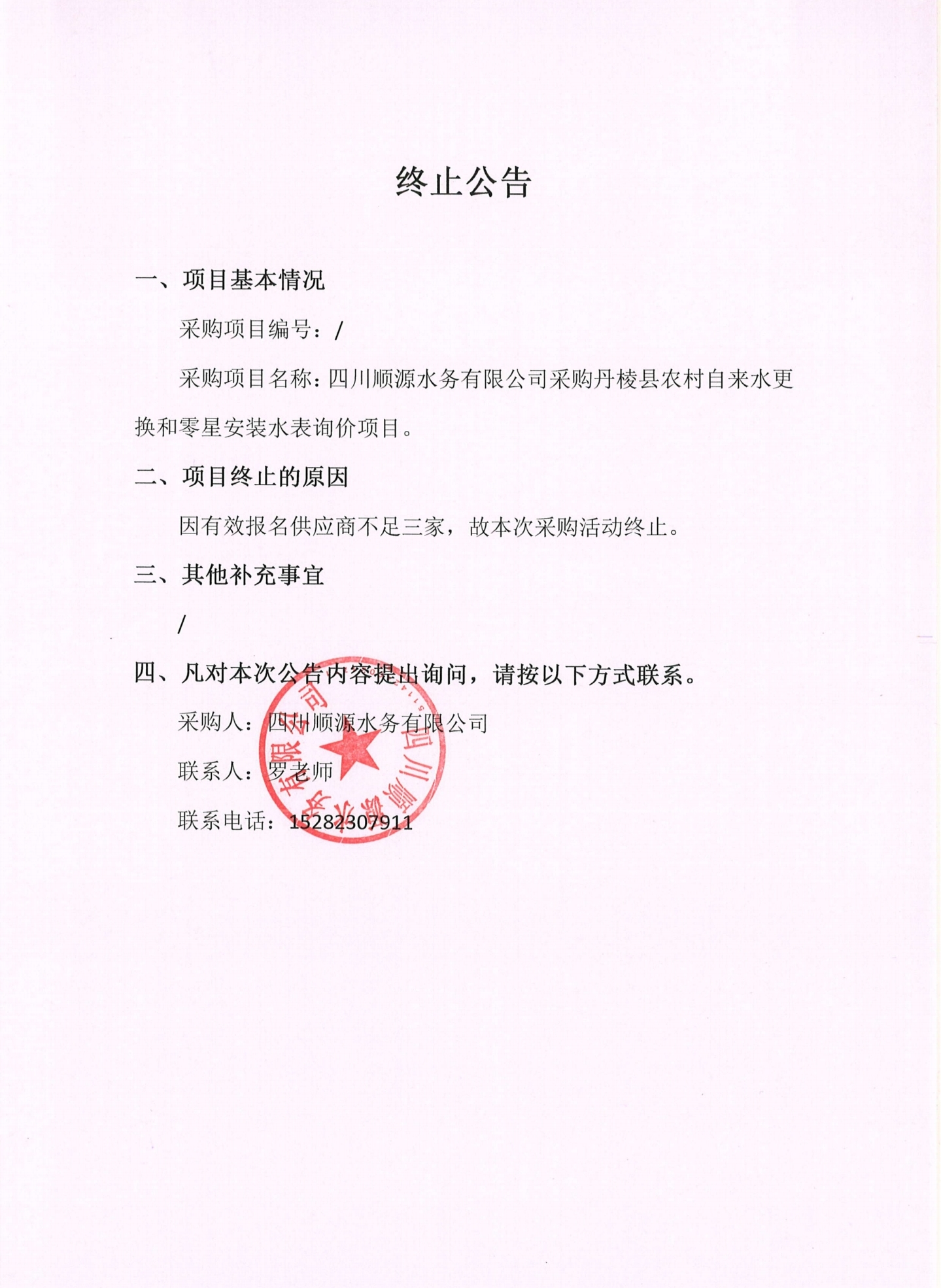 四川順源水務(wù)有限公司采購丹棱縣農(nóng)村自來水更換和零星安裝水表詢價(jià)項(xiàng)目終止公告