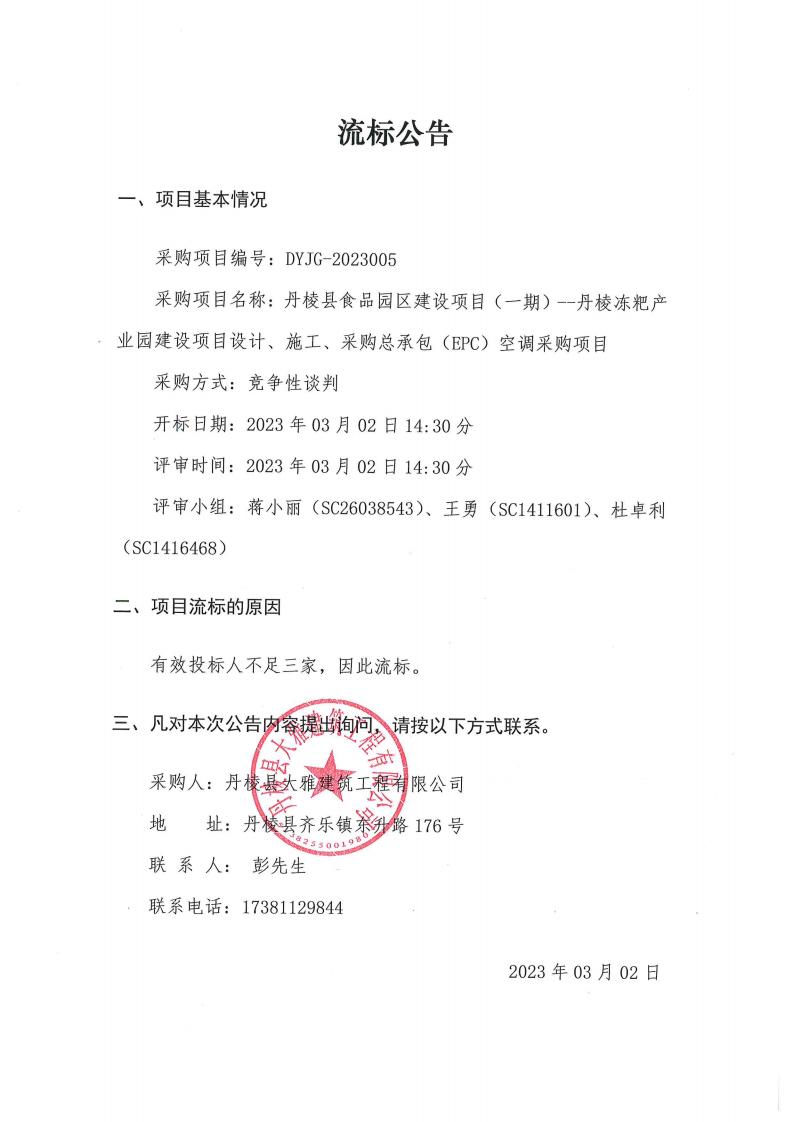丹棱縣食品園區(qū)建設項目(一期)--丹棱凍粑產業(yè)園建設項目設計、施工、采購總承包(EPC)空調采購項目流標公告