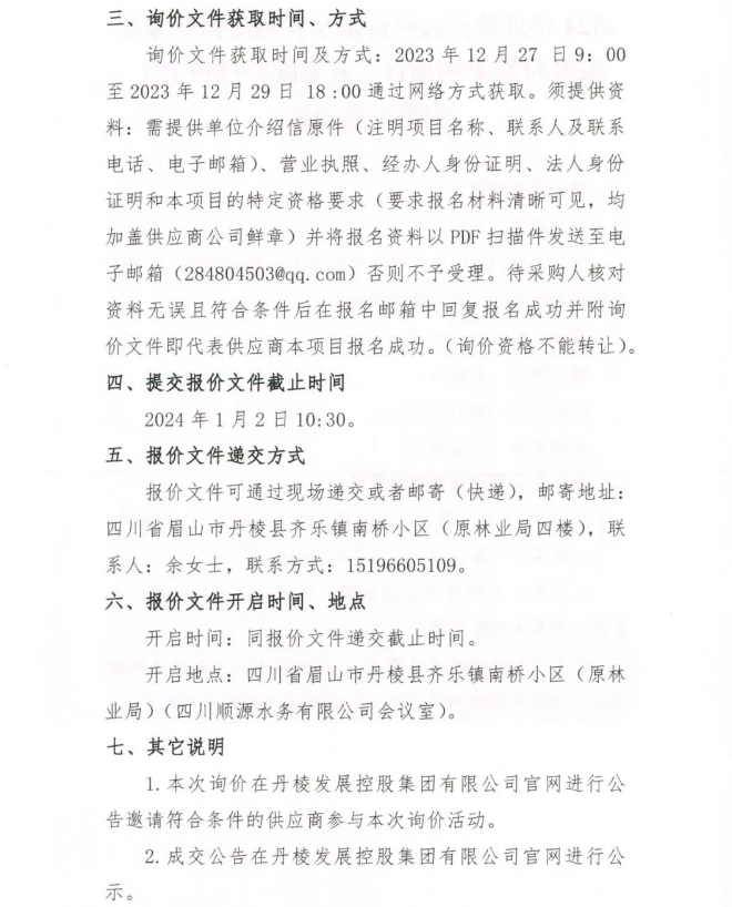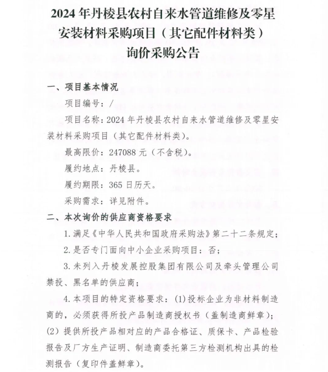 2024年丹棱縣農(nóng)村自來水管道維修及零星安裝材料采購項目 (其它配件材料類 )詢價采購公告