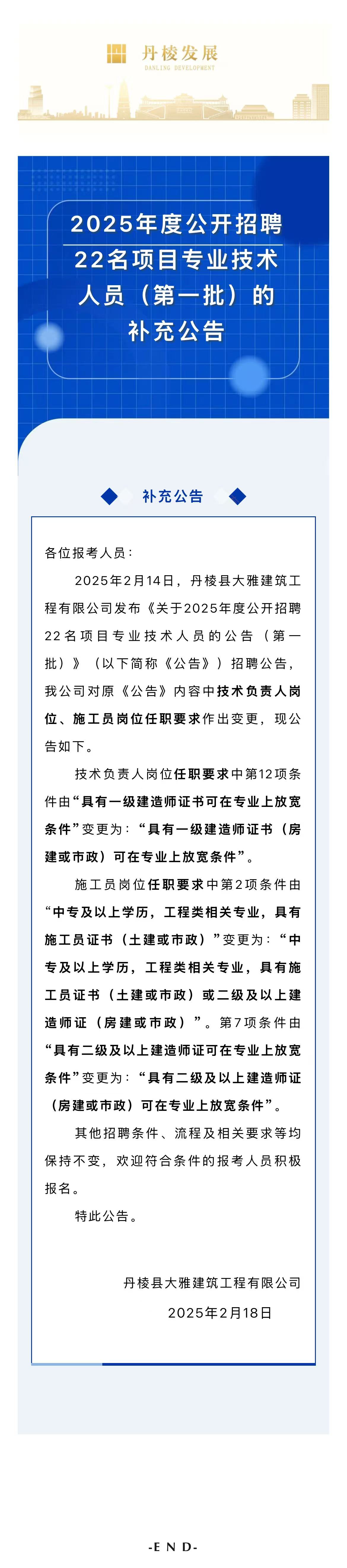丹棱縣大雅建筑工程有限公司關(guān)于2025年度公開(kāi)招聘22名項(xiàng)目專業(yè)技術(shù)人員(第一批)的補(bǔ)充公告